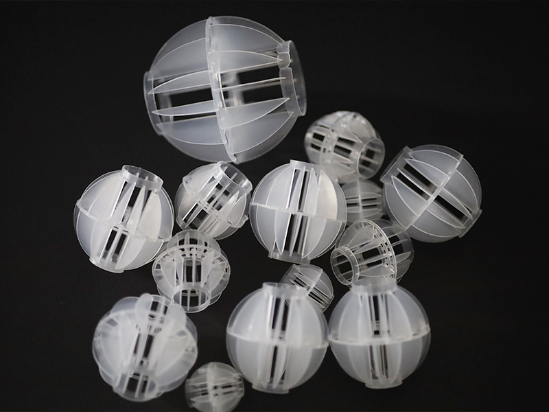 多面空心球由兩個(gè)半圓形球體組成一個(gè)環(huán)保材料,每個(gè)半圓形球有12個(gè)半扇形葉片,其中兩個(gè)半球形葉片彼此錯(cuò)開。其特點(diǎn)是比表面積大、孔隙率高。但由于葉片數(shù)目過多,彼此之間存在一定的遮蔽作用,不利于液體分布和潤濕;液體大多集中在球形中柱內(nèi),阻礙氣體的流通,因而阻力較大。該填料多用于水處理工程。氣速高,葉片多,阻力小,比表面大,可充分進(jìn)行氣液交換:具有阻力小、操作彈性大等優(yōu)點(diǎn),廣泛用于除氯、除氧、除二氧化碳吸收塔、廢氣凈化塔、酸霧凈化塔等環(huán)保設(shè)備中。