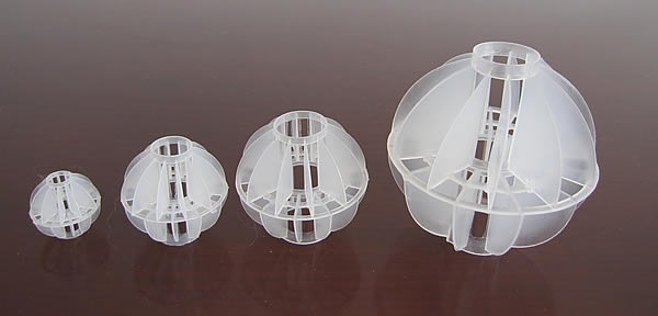 在單位體積中,多面空心球能夠產(chǎn)生最大的膜表面積,因此,當它被噴霧小水滴包圍后,與管形成一種填充材料,在相同體積下可降低40-50%的靜壓損失,并與管形成充填材料,在相同體積下可降低40-50%的體積,在相同體積下可減少35-50%的體積。采用PVC、PP、PE、PVDF、PPS等塑料材料制成的多面體空心球體,PVDF材料是目前世界上純度最高的塑料材料,PVDF材料的天然純度和表面自潤滑性使PVDF可重復(fù)利用,PVDF是目前世界上最高純度的塑料材料,其天然純度和表面自潤滑性使該材料在工業(yè)領(lǐng)域的使用壽命更長(可重復(fù)利用)。