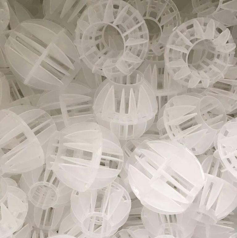 這種塑料多面體是由兩個(gè)半球組成的球形,每個(gè)半球由若干個(gè)半扇形葉片組成,再由兩個(gè)扇形片構(gòu)成。塑膠多面體中空填料具有較大比表面積的優(yōu)點(diǎn),如Dg50的多面體,其比表面積可達(dá)到200m2/m3以上。用于污水處理、電廠水處理脫CO2設(shè)備、脫硫、凈化塔、接觸-反應(yīng)塔等裝置。